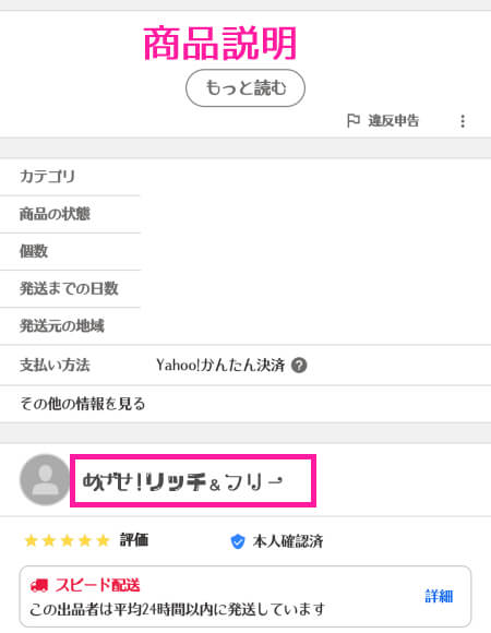 アプリからであれば、商品説明と出品者情報を同時にみることができません。なおさら出品者名をタップしてくれる可能性は低そうな気配です。