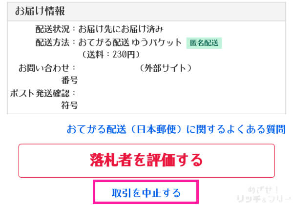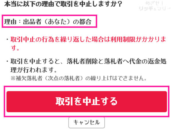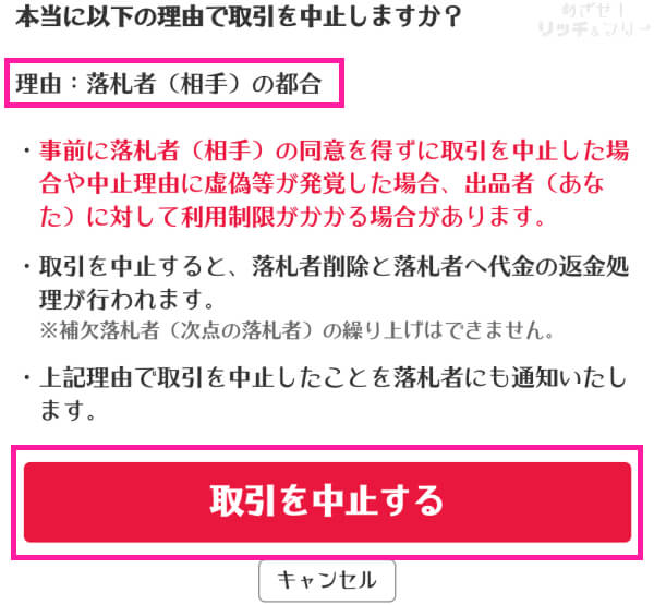 取引中止後に、ちゃんと返金されたか確認してね、みたいなメッセージは送れませんので、必要なやりとりは取引中止前に済ませておいてくださいね。