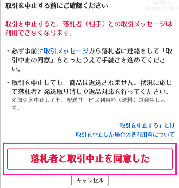 落札者の同意がしっかりと確認できているのであれば「落札者と取引中止を同意した」をクリックします。