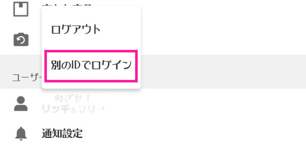 マイページの「ユーザー情報設定」の自分のIDをタップ→「別のIDでログイン」をタップします。